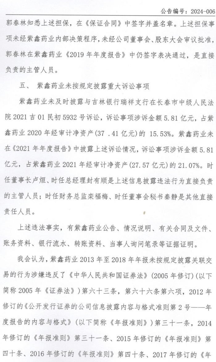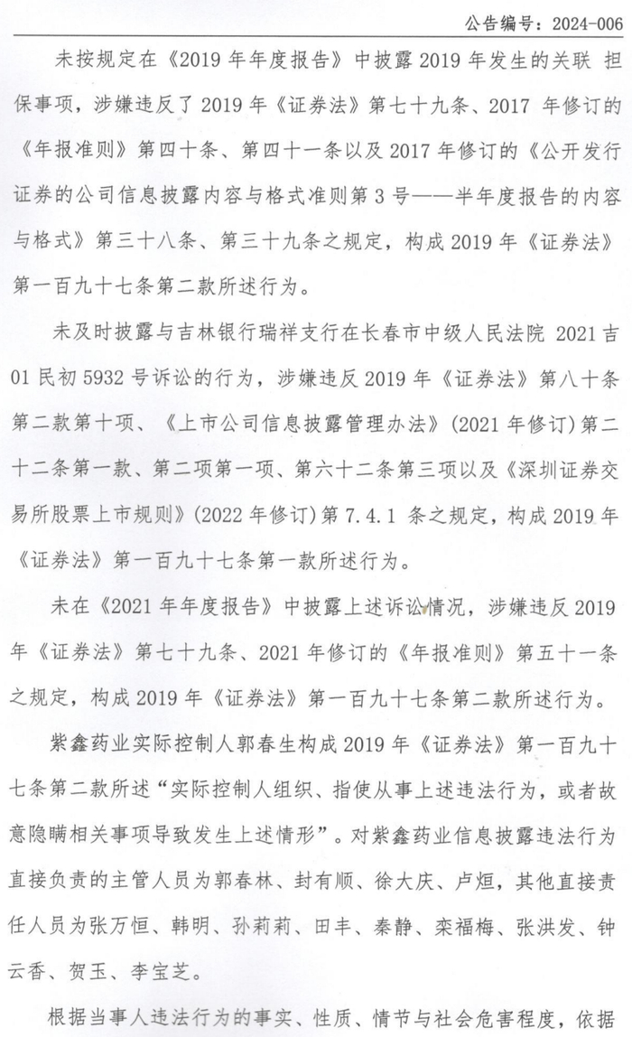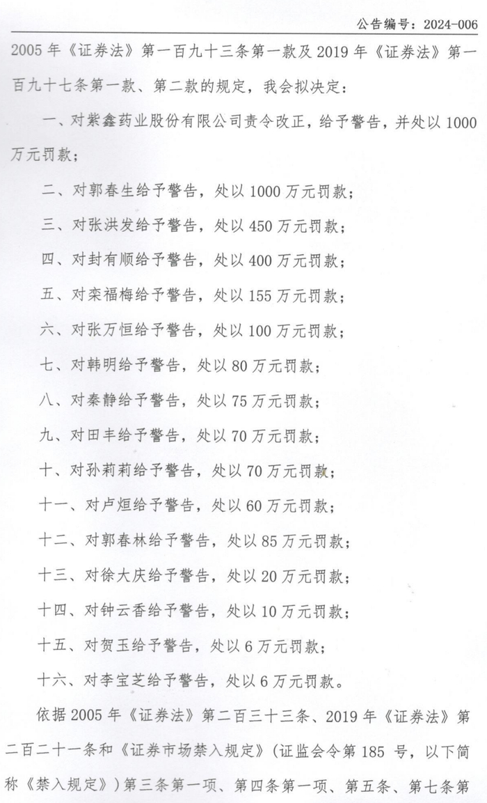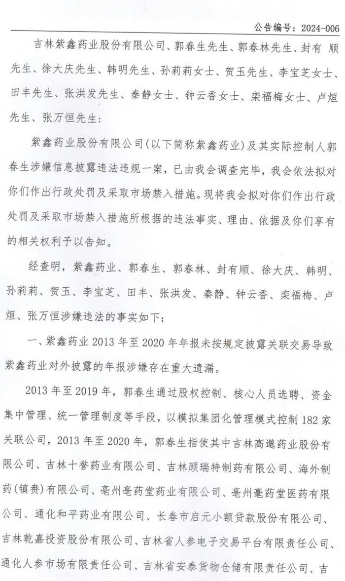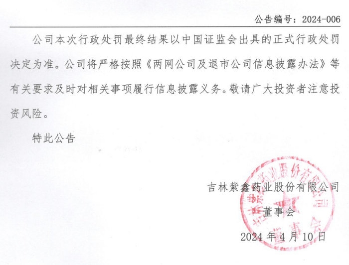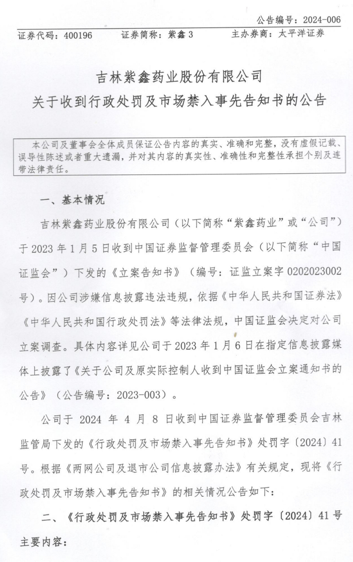 此后,紫鑫药业于2024年4月8日收到中国证券监督管理委员会吉林监管局下发的《行政处罚及市场禁入事先告知书》处罚字(2024)41号,相关内容主要为: