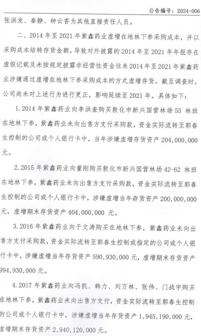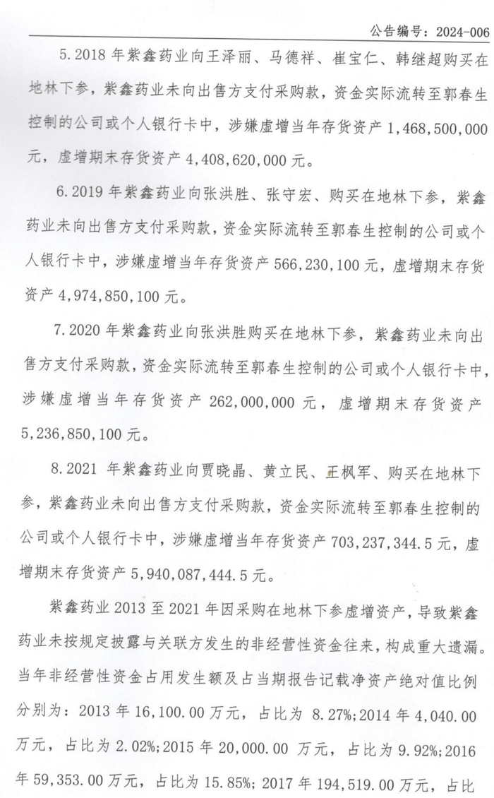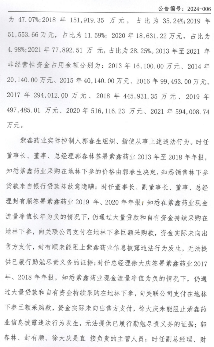 2、紫鑫药业2013至2021年因采购在地林下参虚增资产,导致紫鑫药业未按规定披露与关联方发生的非经营性资金往来,构成重大遗漏当年非经营性资金占用发生额及占当期报告记载净资产绝对值比例分别为:2013年16,100.00万元,占比为8.27%;2014年4,040.00万元,占比为2.02%;2015年20,000.00万元,占比为9.92%;2016年59,353.00万元,占比为15.85%;2017年194,519.00万元,占比为47.07%;2018年151,919.35万元,占比为35.24%;2019年51,553.66万元,占比为11.59%;2020年18,631.22万元,占比为4.98%;2021年77,892.51万元,占比为28.25%。2013年至2021年非经营性资金占用余额分别为:2013年16,100.00万元、2014年20,140.00万元、2015年40,140.00万元、2016年99.493.00万元、2017年294,012.00万元、2018年445,931.35万元、2019年497,485.01万元、2020年516,116.23万元、2021年594,008.74万元。