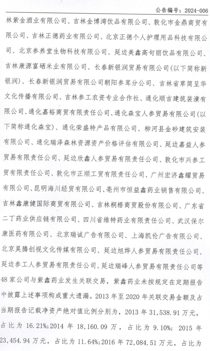 1、2013年至2019年,郭春生通过股权控制、核心人员选聘、资金集中管理、统一管理制度等手段,以模拟集团化管理模式控制182家关联公司,2013年至2020年,郭春生指使其中吉林高邈药业股份有限公司、吉林十誉药业有限公司、吉林顾瑞特制药有限公司等48家公司与紫鑫药业发生关联交易,紫鑫药业未按规定在定期报告中披露上述事项构成重大遗漏。2013年至2020年关联交易金额及占当期报告记载净资产绝对值比例分别为,2013年31,538.91万元占比为16.21%;2014年18,160.09万,占比为9.10%;2015年23,454.94万元,占比为11.64%;2016年72,084.51万元,占比为19.25%;2017年227,019.90万元,占比为54.94%;2018年184,079.16万元,占比为42.71%;2019年89,814.14万元,占比为20.20%;2020年18,703.36万元,占比为5%。