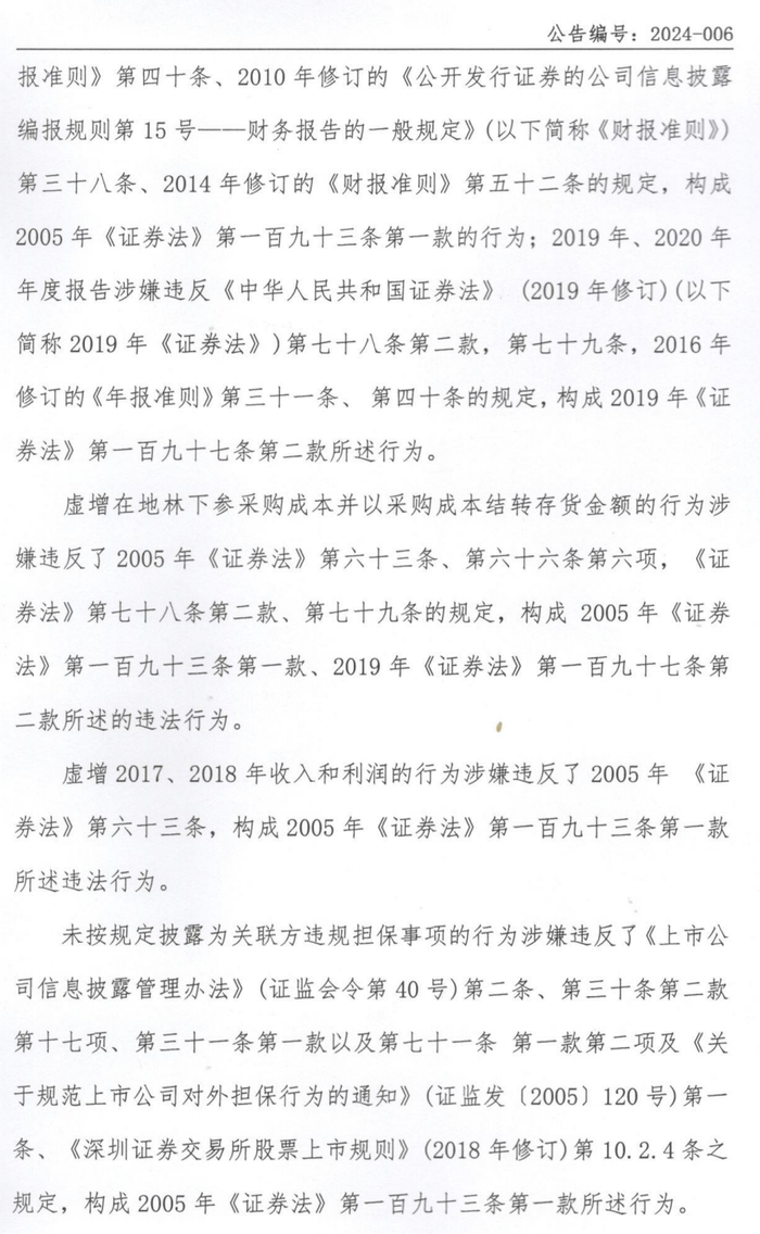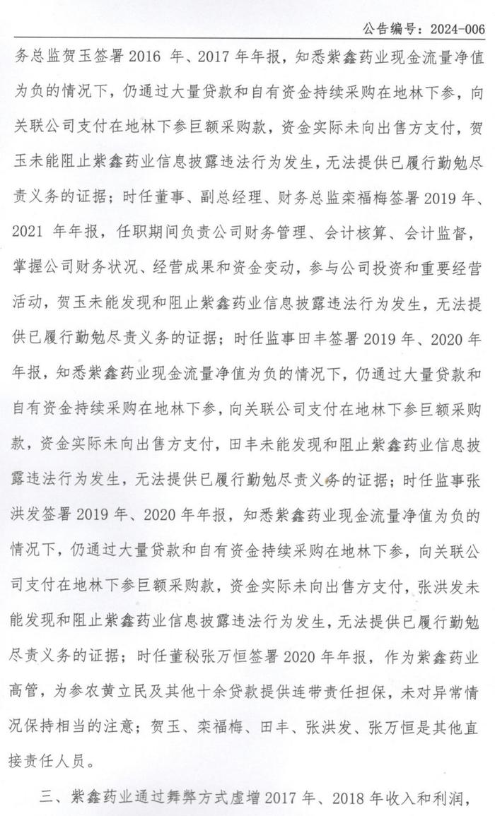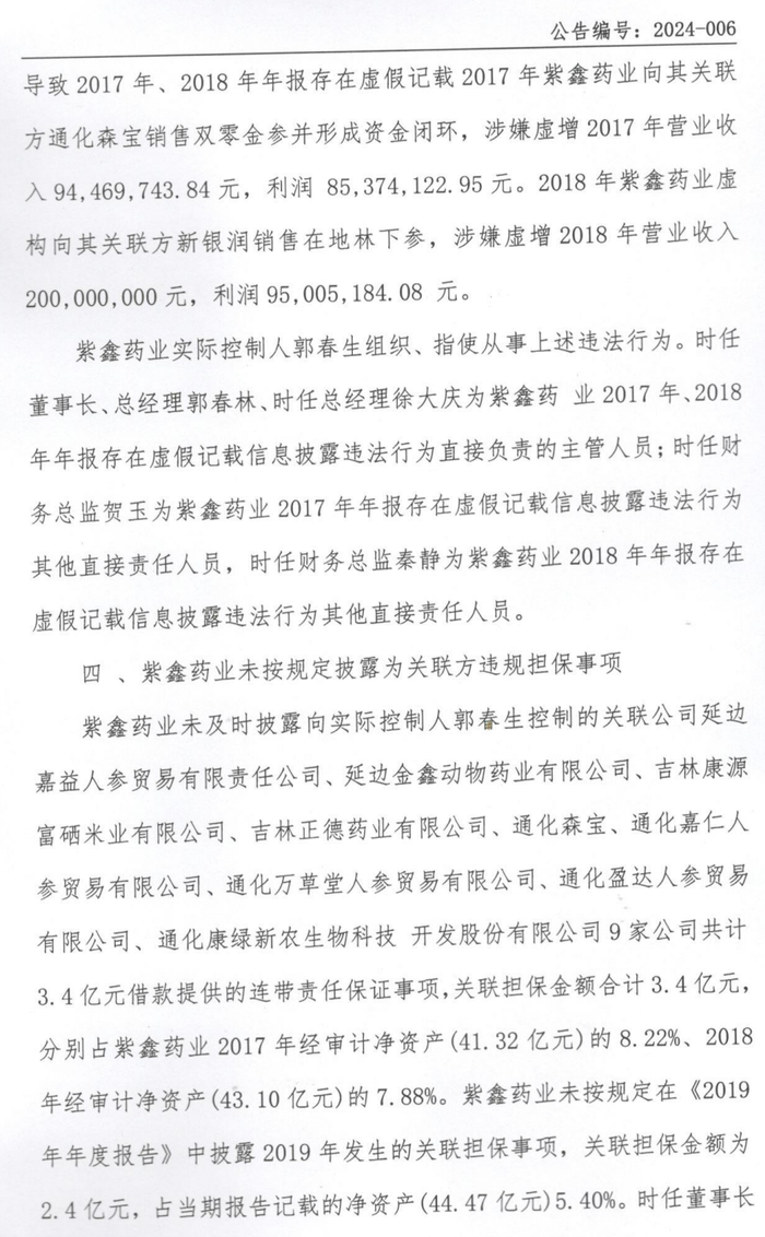 3、紫鑫药业通过舞弊方式虚增2017年、2018年收入和利润导致2017年、2018年年报存在虚假记载。2017年紫鑫药业向其关联方通化森宝销售双零金参并形成资金闭环,涉嫌虚增2017年营业收入94,469,743.84元,利润85,374,122.95元。2018年紫鑫药业虚构向其关联方新银润销售在地林下参,涉嫌虚增2018年营业收入200,000,000元,利润95,005,184.08元。