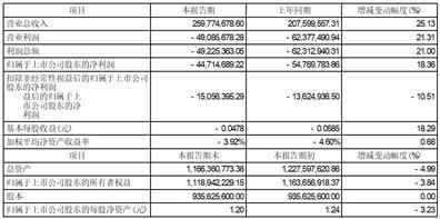 本报告期,公司实现营业总收入25,977.47万元,较上年同期增长25.13%;营业利润-4,908.57万元,较上年同期增长21.31%;利润总额-4,922.54万元,较上年同期增长21.00%;实现归属于上市公司股东的净利润-4,471.47万元,较上年同期增长18.36%。