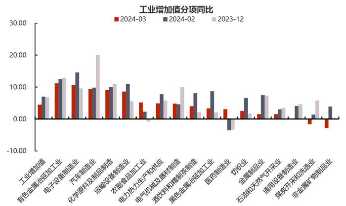 建筑业复工复产缓慢拖累黑色产业产值表现。3月规模以上工业增加值同比录得4.5%,增速较1-2月下滑2.3个百分点,环比回落0.08%。工业增加值相对疲软的表现与上周公布的工业品价格指数相印证。春节偏后,基建与房建复工缓慢拖累黑色产业相关的产值表现(如黑色金属冶延加工业、煤炭采选业、水泥相关制造业等)。增速靠前的有色金属冶延加工业、电子设备制造业、汽车制造业及运输设备制造业等则多与3月出口增长相关。