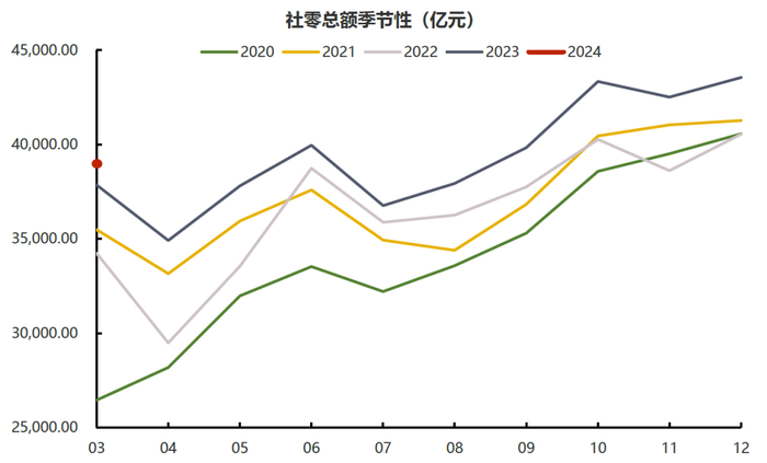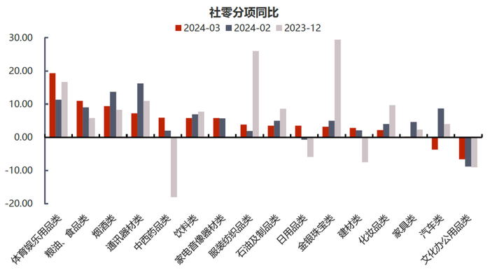 3月社零表现依旧强于季节性,但增速有所回落。3月社会消费品零售总额同比增长3.1%,1-3月累计同比增长4.7%,餐饮收入仍强于商品零售。消费仍在延续去年持续强于季节性的表现,但其增速表现相对中性。去年3-5月得益于消费场景的开放,社零同比增速抬升至近年高位,高基数影响下今年3月社零同比回落2.4个百分点。但1-3月累计同比4.7%的增幅相较去年全年7.2%的增速仍有不小的下滑,更是低于疫情前9.5%左右的增速中枢以及2021年12.5%的增速表现。结构上看,大多商品仍保持同比正增长。其中,由于今年春节假期偏晚,食品饮料、烟酒及文娱用品在2-3月增长较快。值得注意的是,3月汽车零售同比增速转负录得-3.7%,而乘联会数据显示3月汽车零售销量增长近6%,因而汽车零售额的下滑或与开年来车企价格战相关。在此前对于2024年消费前景展望中我们表示,由于房产失去增长预期叠加可支配收入增速下行,居民资产负债表受损,储蓄意愿偏高。政策端2024年若无采取对于居民部门的转移支付,社零增速或将下滑至4.5%左右。今年两会部署“消费品以旧换新”作为提振消费需求的主要思路,按过往经验或将以换购补贴的方式开展,但其具体实施方案、商品范围及效果仍有待进一步观测。