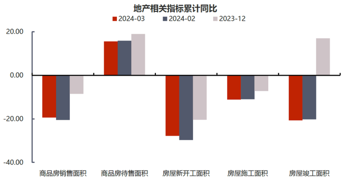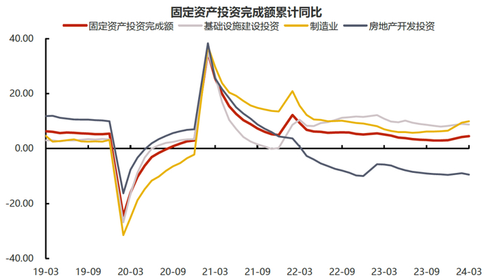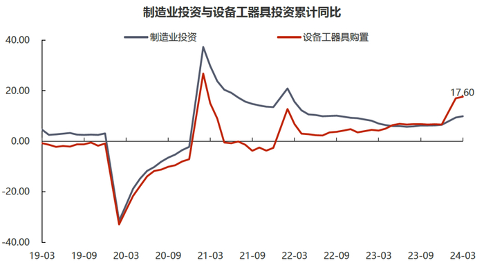 制造业投资增速加快,基建投资尚未发力。1-3月固定资产投资累计同比上行0.3个百分点至4.5%,增速略有提高。其中,房地产开发投资下滑0.5个百分点至-9.5%,基建投资下滑约0.2个百分点至8.75%,制造业投资上升0.5个百分点至9.9%。房地产开发投资持续受制于地产销售显著弱于季节性的表现对拿地及新开工的传导,其同比进一步下滑,相关指标均未见改善。值得注意的是,伴随新开工持续偏弱以及部分风险有限的保交楼项目完工,今年以来房地产竣工面积也开始出现明显负增。基建方面,1-3月专项债发行6341亿元(两会部署全年额度为39000亿元,当前完成约16%)发行节奏偏缓,基建投资尚未出现明显发力迹象。但考虑到海外降息预期的后延,上半年国内经济压力仍较大,二季度或能见到政府债券投放提速。制造业投资则受益于两会部署的“推动大规模设备更新”要求,自2月开始便快速抬升,设备工器具购置投资增速更是快速上行至17.6%,是开年以来各项经济数据中的亮点。按国务院印发的《推动大规模设备更新和消费品以旧换新行动方案》中的要求,到2027年各领域设备更新规模较2023年增长25%以上,对应着约5.2万亿设备市场中约5.7%的年复合增长率(前四年约为-0.03%),即四年共计1.3万亿左右的投资量级。而制造业投资以其在设备工器具投资中近八成的占比也将明显受益,成为带动经济增长的边际变量。
