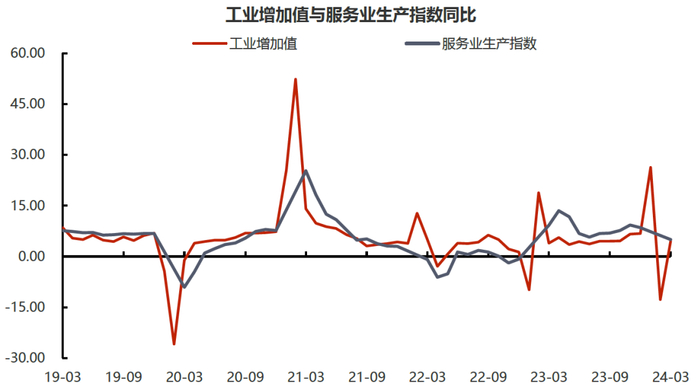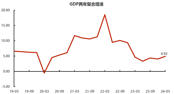 2024年一季度GDP增长超出预期,主要由第二产业带动。今年一季度我国实际GDP同比增5.3%,超出此前4.6%的市场预期。去年同期感染人数逐渐过峰,居民生活半径显著增加,加之积压需求及订单的快速释放,带动一季度经济明显恢复,实际GDP增长4.5%,两年复合增速为年内最高点。在这样正常化的基数下,今年一季度5.3%的增速数据明显好于预期。但值得注意的是,本期GDP结构与去年略有不同。去年同期得益于管控措施的解除,服务业快速恢复拉动第三产业增长5.8%。而本期在“推动大规模设备更新”的带动下,制造业投资拉动第二产业增长6.0%,推升整体GDP增速约2.24%(拉动力较去年提升约0.5个百分点),构成整体GDP的支撑力量。