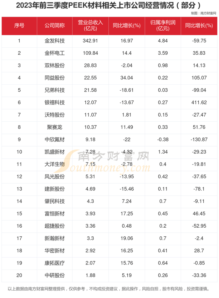 当前,A股共有20家PEEK材料相关上市公司,2023年前三季度营业收入合计614.59亿元,归母净利润共15.66亿元。其中,2家上市公司营业收入超100亿,8家上市公司营业收入超十亿。