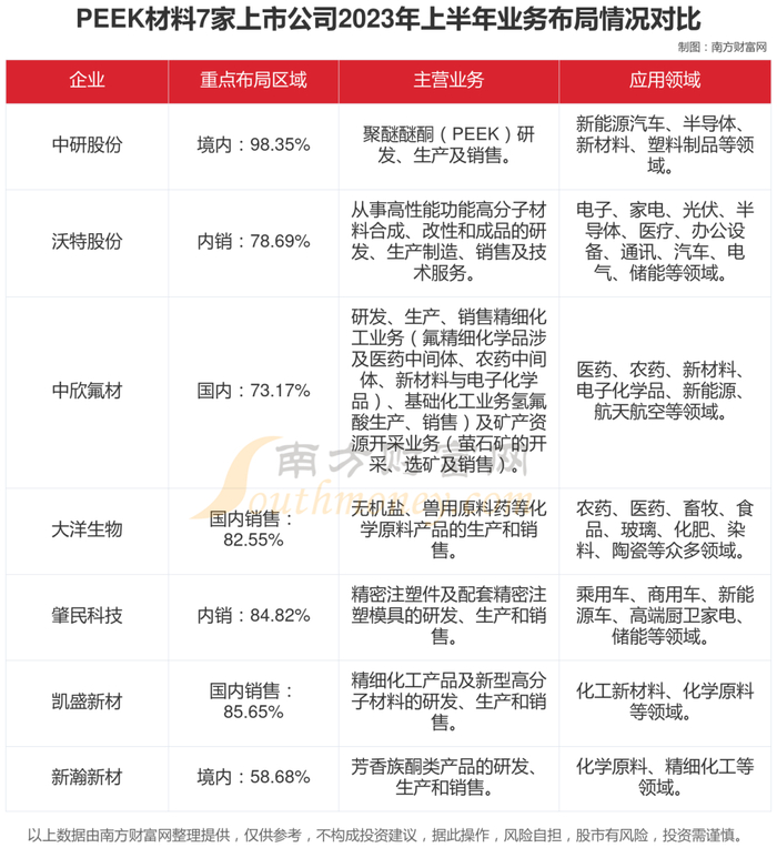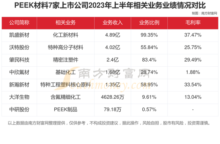 根据南方财富网趋势选股系统数据显示,凯盛新材、沃特股份、肇民科技、中欣氟材、新瀚新材、大洋生物、中研股份相关业务分别为化工新材料、特种高分子材料、精密注塑件、基础化工、特种工程塑料核心原料、含氟精细化工、PEEK制品,2023年上半年业务营收分别为4.89亿、4.02亿、2.4亿、1.68亿、1.35亿、4628.26万、79.18万,分别占公司营业总收入比例为99.35%、55.84%、83.4%、28.74%、58.95%、9.61%、0.57%。