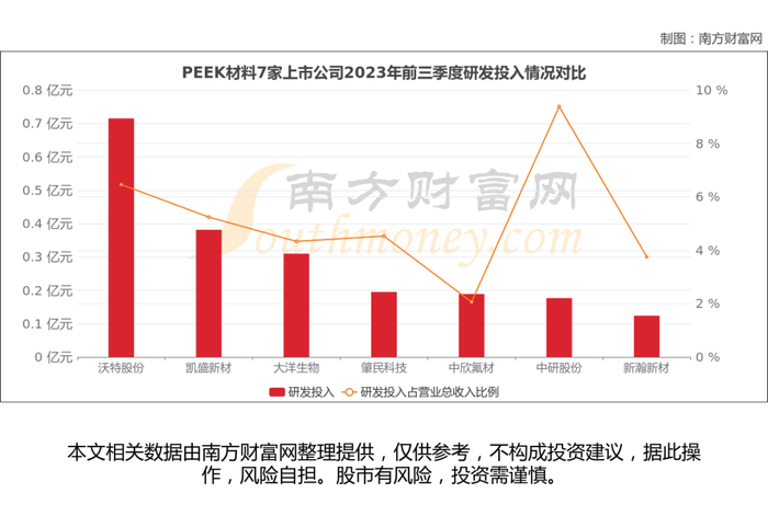 研发投入层面来看,2023年前三季度沃特股份研发投入7149.9万元,占公司营业总收入比例6.46%;凯盛新材研发投入3811.88万元,占公司营业总收入比例5.24%;大洋生物、肇民科技、中欣氟材、中研股份、新瀚新材2023年前三季度研发投入分别为3095.95万元、1949.16万元、1888.43万元、1764.77万元、1237.1万元,占公司营业总收入比例分别为4.33%、4.53%、2.06%、9.38%、3.75%。