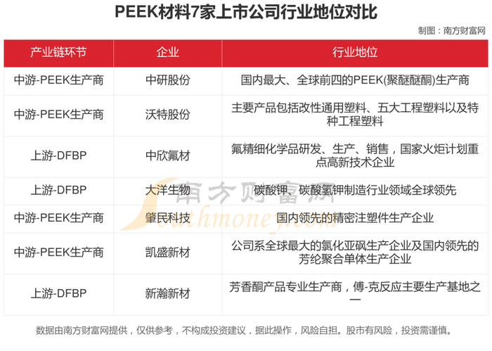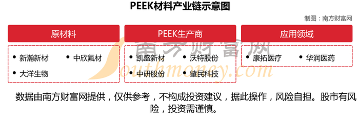 原材料公司主要包括新瀚新材、中欣氟材、大洋生物;PEEK生产商公司主要包括凯盛新材、沃特股份、中研股份、肇民科技;应用领域公司主要包括康拓医疗、华润医药。
