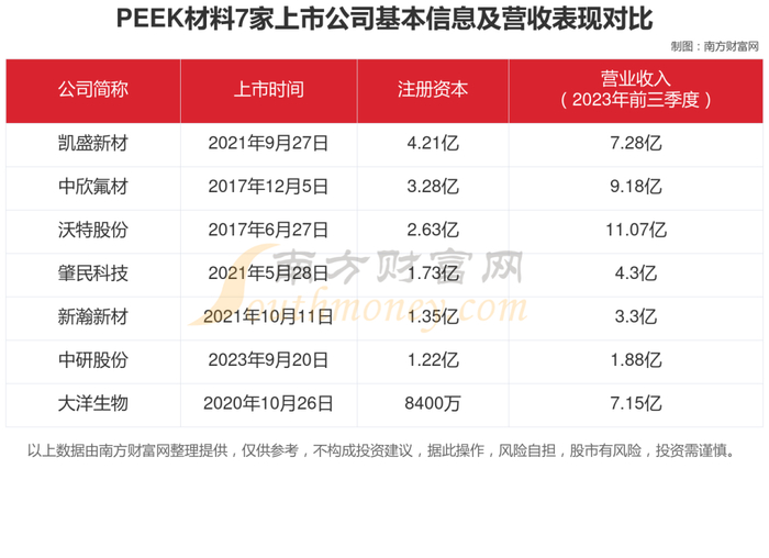 这些上市公司中,凯盛新材注册资本高达4.21亿,2023年前三季度公司营业收入7.28亿元;中欣氟材注册资本3.28亿,2023年前三季度公司营业收入9.18亿元;沃特股份、肇民科技、新瀚新材、中研股份、大洋生物注册资本分别为2.63亿、1.73亿、1.35亿、1.22亿、8400万,2023年前三季度营业收入分别为11.07亿、4.3亿、3.3亿、1.88亿、7.15亿。