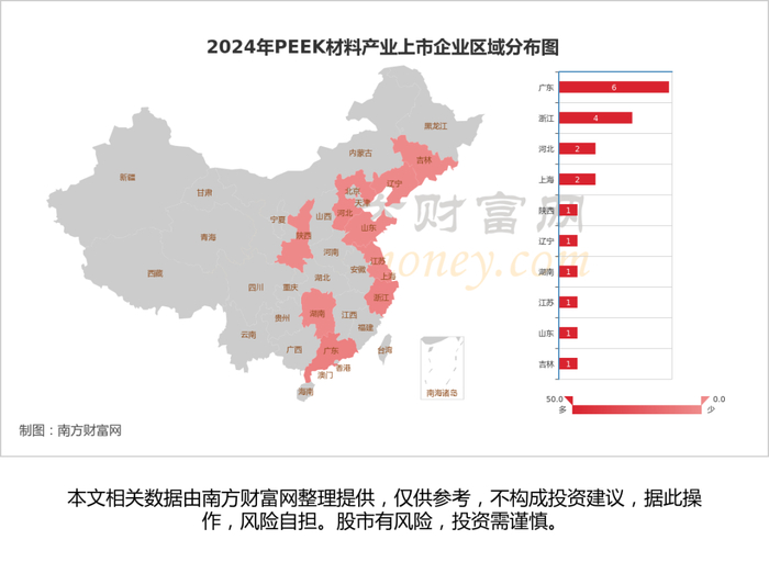 从上市公司地区的分布情况来看,A股20家PEEK材料相关上市公司分布在广东、浙江、上海、河北、吉林等省市,总体来看主要集中于华东区域。