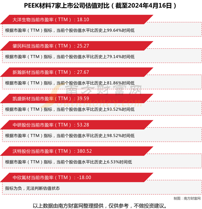 估值来看,截至2024年4月16日大洋生物的市盈率为18.10,当前个股估值水平比历史上99.64%时间低;肇民科技的市盈率为25.27,当前个股估值水平比历史上79.14%时间低;新瀚新材、凯盛新材、中研股份、沃特股份市盈率分别为27.67、39.59、53.28、380.52,当前个股估值水平分别比历史上81.86%、93.52%、98.52%、6.53%时间低。