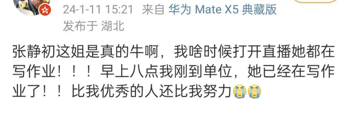 学生党还没起床,张静初就已经坐那开始写了,打工人已经睡下,姐还在一边挠头一边奋笔疾书呢。