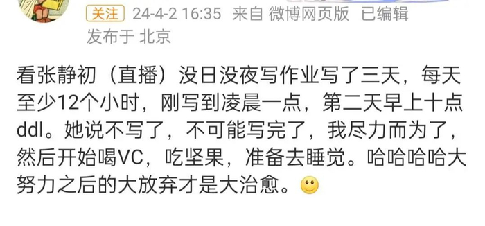 直播这次,已经连续三天只睡四个小时全力赶作业,到第四天还要至少15个小时才能写完。