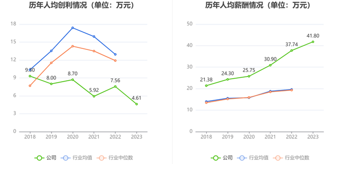 截至2023年末,公司员工总数为3419人,人均创收201.26万元,人均创利4.61万元,人均薪酬41.80万元,较上年同期分别变化-7.89%、-39.07%、10.76%。
