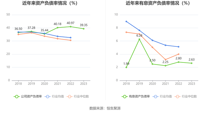 在偿债能力方面,公司2023年年末资产负债率为39.35%,相比上年末下降1.62个百分点;有息资产负债率为2.63%,相比上年末下降0.17个百分点。