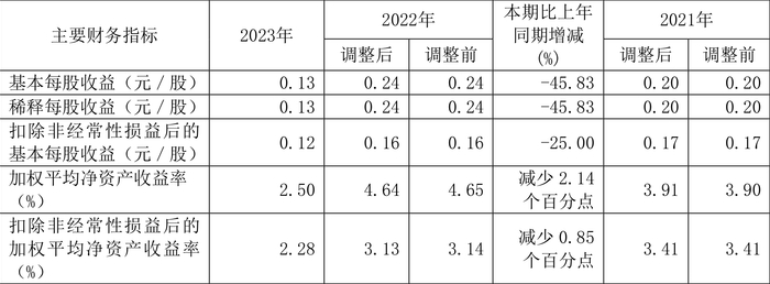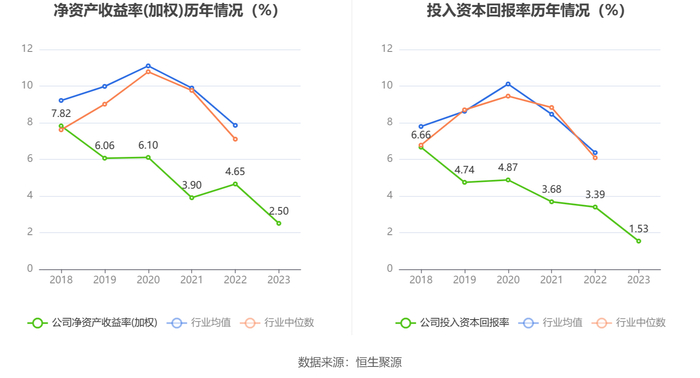 数据显示,2023年公司加权平均净资产收益率为2.50%,较上年同期下降2.15个百分点;公司2023年投入资本回报率为1.53%,较上年同期下降1.86个百分点。