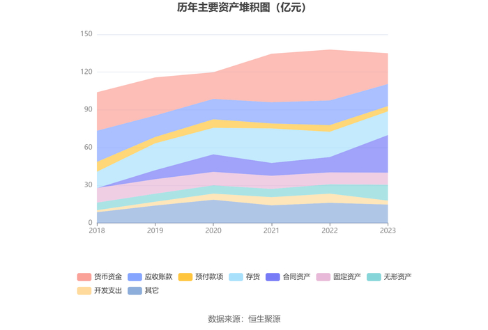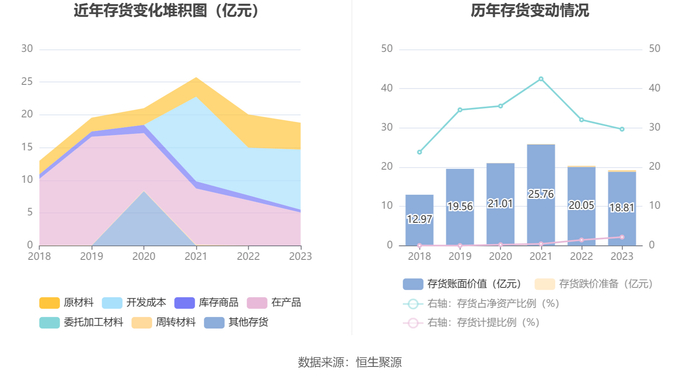 从存货变动来看,截至2023年年末,公司存货账面价值为18.81亿元,占净资产的29.68%,较上年末减少1.24亿元。其中,存货跌价准备为4165.81万元,计提比例为2.17%。