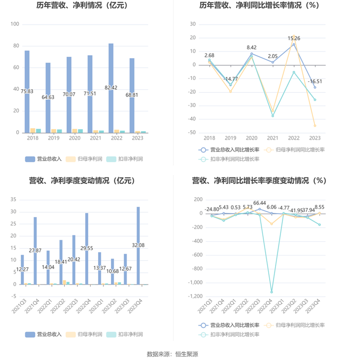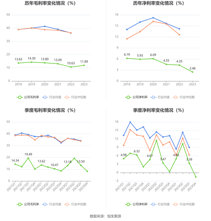 2023年,公司毛利率为11.89%,同比上升1.26个百分点;净利率为2.46%,较上年同期下降1.89个百分点。从单季度指标来看,2023年第四季度公司毛利率为8.23%,同比下降0.34个百分点,环比下降5.27个百分点;净利率为-1.52%,较上年同期下降1.90个百分点,较上一季度下降4.90个百分点。