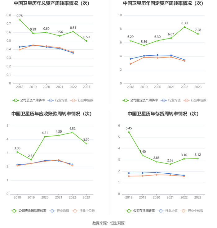营运能力方面,2023年,公司公司总资产周转率为0.50次,上年同期为0.61次(2022年行业平均值为0.36次,公司位居同行业10/137);固定资产周转率为7.28次,上年同期为8.30次(2022年行业平均值为3.51次,公司位居同行业18/137);公司应收账款周转率、存货周转率分别为3.70次、3.12次。