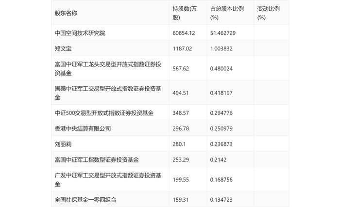 年报显示,2023年年末公司十大流通股东中,新进股东为全国社保基金一零四组合,取代了三季度末的中信建投证券股份有限公司。在具体持股比例上,郑文宝、国泰中证军工交易型开放式指数证券投资基金、刘丽莉持股有所上升,富国中证军工龙头交易型开放式指数证券投资基金、中证500交易型开放式指数证券投资基金、香港中央结算有限公司、富国中证军工指数型证券投资基金、广发中证军工交易型开放式指数证券投资基金持股有所下降。