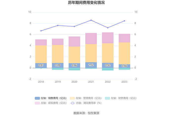 2023年,公司期间费用为5.82亿元,较上年同期减少1210.63万元;但期间费用率为8.45%,较上年同期上升1.24个百分点。其中,销售费用同比下降28.25%,管理费用同比增长11.79%,研发费用同比下降20.84%,财务费用由去年同期的-4483.76万元变为-3134.37万元。