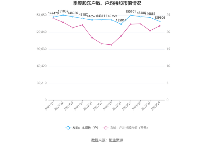 筹码集中度方面,截至2023年年末,公司股东总户数为13.98万户,较三季度末下降了7080户,降幅4.82%;户均持股市值由三季度末的20.43万元上升至21.84万元,增幅为6.90%。