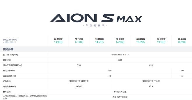 广汽埃安 AION S MAX 共有 7 款配置,于 2023 年 10 月发布,可选 510 公里和 610 公里两种续航,定价 14.99 万元起,现全系官降 1 万元(IT之家注:行政版除外)。