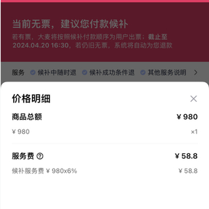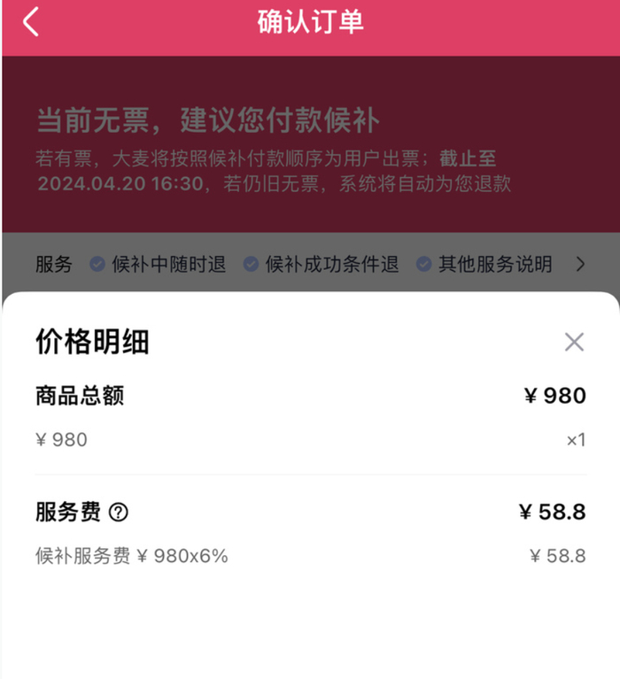 不同的是,在演唱会候补门票预付款时,用户还需同时支付总票价的6%候补服务费。以980元这张候补门票为例,系统显示需支付1038.8元。价格明细里则注明:商品总额980元,候补服务费58.8元。