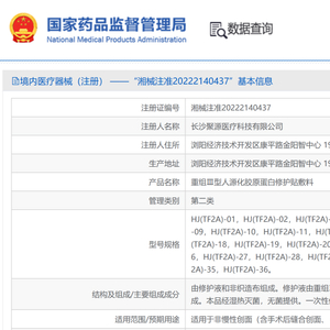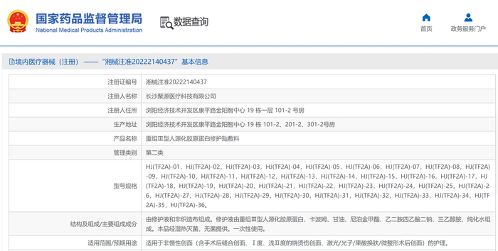 从商品详情页看,该产品属二类医疗器械,注册证号为湘械注准20222140437。根据国家药监局数据查询显示,该产品注册人为长沙聚源医疗科技有限公司,产品名称为重组Ⅲ型人源化胶原蛋白修护贴敷料。由修护液和非织造布组成。修护液由重组Ⅲ型人源化胶原蛋白、卡波姆、甘油、尼泊金甲酯、乙二胺四乙酸二钠、三乙醇胺、纯化水组成。本品经湿热灭菌,无菌提供。一次性使用。