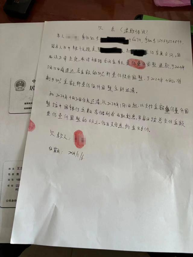 今年1月6日,考虑到前述原因且已逾期半个多月,他向该兔宝宝易装门店提出了退款申请。同日,该门店的负责人给赵先生手写签了一份退款协议,其中显示,因无法正常交货承诺根据合同金额31000元退款,退款分为两次:今年3月15日前退还16000元,4月30日前退还15000元。