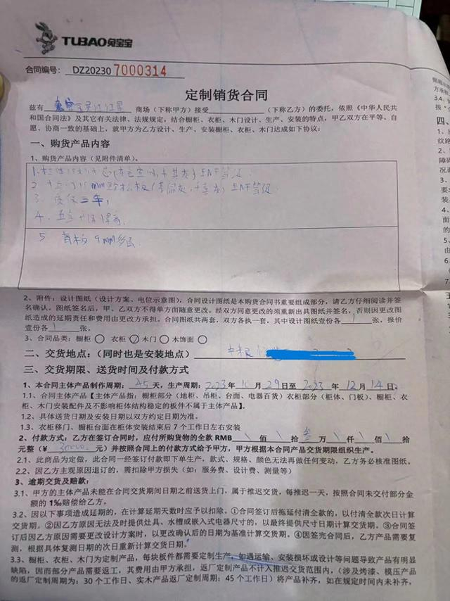 赵先生介绍,去年11月,他的新家即将正式交付。为装修新家,他于10月底到红星美凯龙(苏州吴江商场)看家具,在兔宝宝易装门店定制了木门。10月29日,双方签订了《定制销货合同》。该合同显示,赵先生所购货物的全款为30000元,产品制作周期为45天(同年12月14日前)。赵先生加购了一个小柜子,售价1000元,通过微信转账给门店负责人,共花费31000元。
