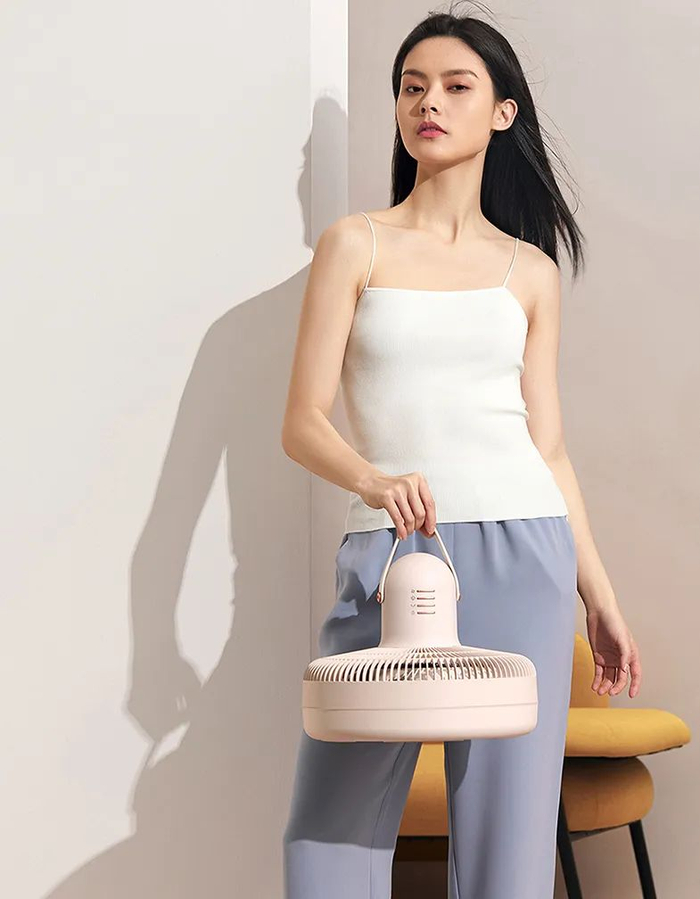体积小巧,风扇头上还有一个皮革提手,一拎即走。