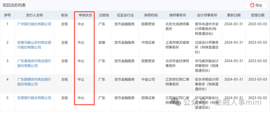 3月31日,深交所官网披露显示,广州银行、广东顺德农村商业银行、广东南海农村商业银行、东莞银行、安徽马鞍山农村商业银行等五家银行的IPO申请被中止,原因均为IPO申请文件中记录的财务资料已过有效期,需要补充提交。