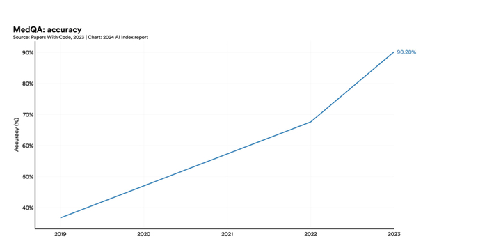 过去几年,人工智能在MedQA(医学文本问答数据集)基准上表现出了显著的进步,这是评估人工智能临床知识的关键测试。GPT-4 Medprompt的准确率达到了90.2%,比2022年的最高分提高了22.6 个百分点。自2019年推出该基准测试以来,人工智能的准确性几乎增加了两倍。