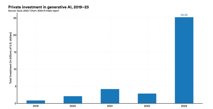 生成式人工智能的领域资金比2022年增长了近八倍,达到252亿美元。
