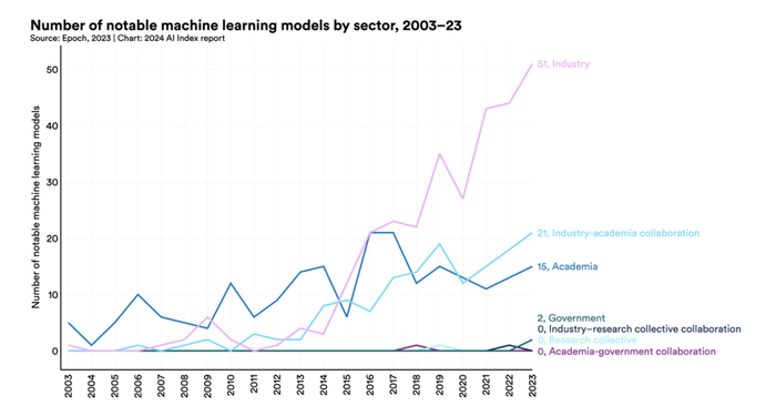 2023年,产业界发布了51个值得关注的机器学习模型,而学术界仅贡献了15个。缺乏算力的学术界在当下人工智能的发展上仍然处于劣势,推动了相关人才从学术届向产业界转移。2019年,美国和加拿大新增加的人工智能领域教师有13%来自产业界。到2021年,这一数字已下降至11%,2022年进一步下降至7%。