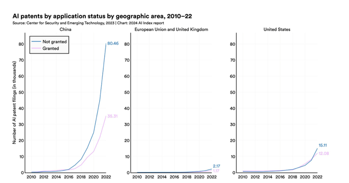2023年,美国发布了61个值得关注的机器学习模型,欧盟和中国分别是21个和15个。但值得关注的是,中国已经在2022年以61.1%的份额成为全球人工智能专利最大来源国,美国人工智能专利份额则从2010 年的54.1%下降至2022年的20.9%。