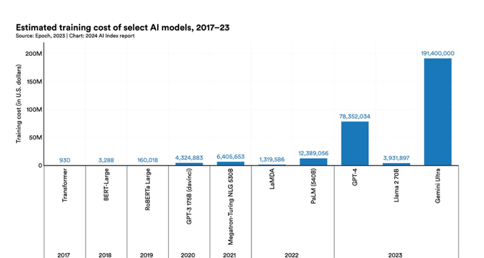 OpenAI的GPT-4训练成本高达7800万美元,而Google的Gemini Ultra更是达到了惊人的1.91亿美元。