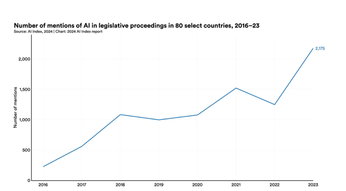 2023年,美国人工智能相关法规数达到了25个,而2016年仅有1个。全球各国的法律法规提及人工智能的次数从2022年的1247次增加到2023年的2175次,几乎翻了一番。