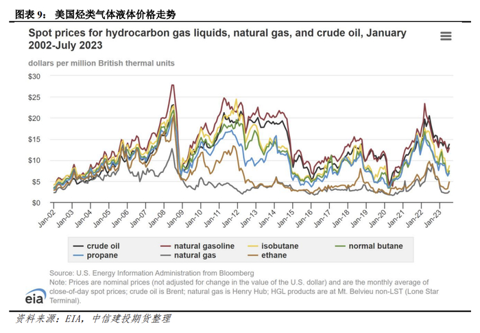1)2011年,美国由丙烷的净进口国家转变为净出口国家,美国MB地区乙烷价格开始受到海外需求的影响,出现了背离原油以及石脑油等精炼产品的价格走势。