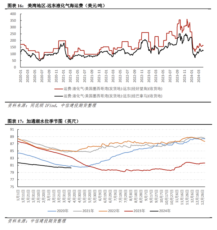 海运费也是影响丙烷价格的重要因素,自 2023 年年末红海危机事件来,地缘危机的持续性带来了对于全球运力的担忧,造成了海运费价格的波动率显著提升。同时受干旱天气的影响,巴拿马运河加通湖水位五年同期最低位,干旱天气造成巴拿马运河水位降低进而导致运费价格上涨的担忧。