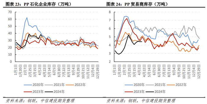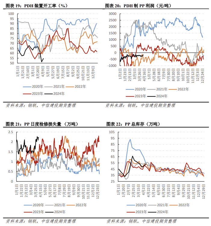 在当前PP各生产方式利润压缩的背景下,春季检修量持续提升。对PDH装置而言,生产的进料较为单一、链条较短且转产其他产品不如其他工艺,因此 PDH 生产方式相较其他工艺的利润敏感性更高,开工率当前处于五年同期最低位。