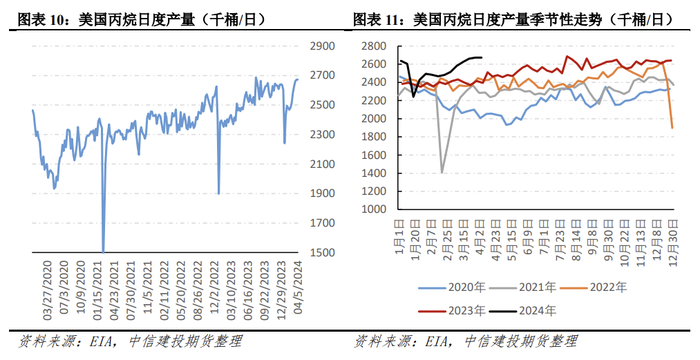 美国丙烷产量在2020-2024年保持相对稳定增速,产量年化增长率7%。2024年4月5日,丙烷日度产量2673千桶/日,较2023年同期增长11.6%,丙烷产量增速加快,表现出超越季节性的增长趋势。