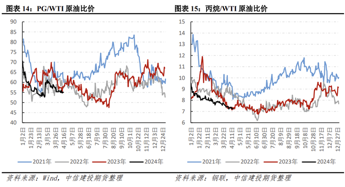 而从估值角度看,当前无论PG/原油比价还是丙烷/原油比价均来到了近几年同期的低点,进一步下行的空间有限,预计短期内丙烷价维持震荡偏强。
