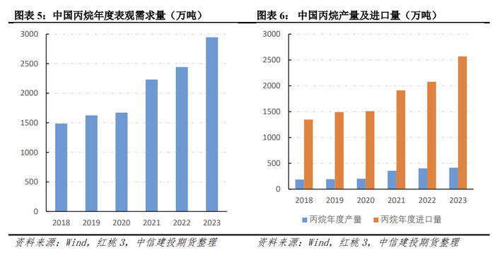 截至2023年,我国丙烷年度表观需求量2946万吨,2018-2023年年化增长率12.25%;丙烷年度产量413万吨,2018-2023年年化增长率17.44%;丙烷年度进口量2568万吨,2018-2023年年化增长率13.79%;2018年-2023年进口依存度自90.61%下降至87.19%,总体变化不大,对于海外丙烷需求仍较大。