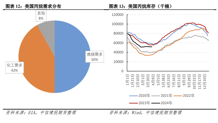 当前处于燃烧需求淡旺季的转换之际,旺季去库幅度尚可,当前美国丙烷库存处于五年同期中性水平,当化工需求季节性回升后存在着一定对丙烷价格的正反馈基础。