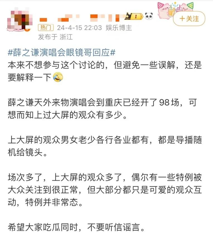 演唱会结束当晚,“眼镜男”随即开启直播,收到观众打赏礼物,迅速涨粉。15日,“眼镜男”又发视频回应,称自己和女观众是“前男女朋友”,已经分手。有网友发现,女观众也是有20多万粉丝的网红博主。
