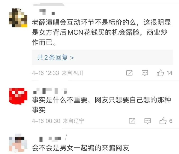 但随着事件后续走向和细节浮出水面,人们发现,事情似乎没那么简单。一些网友的评论指出:男女主角可能都是“演员”,薛之谦演唱会只不过是他们的“秀场”。