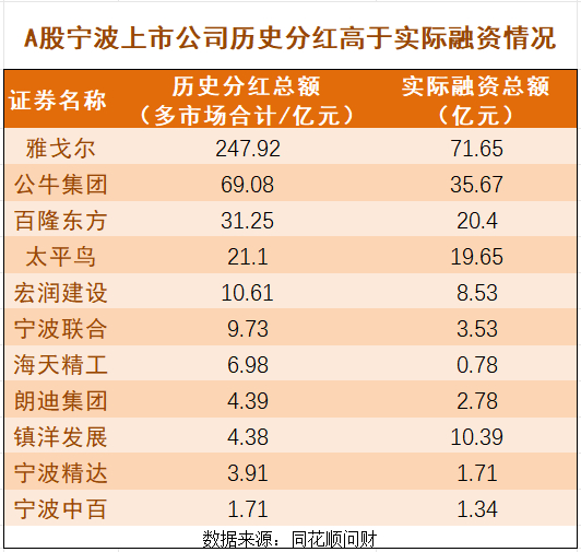 在A股“宁波军团”中,有11家甬企历史分红金额已高于融资总金额,实现“质”的积累。雅戈尔、公牛集团、百隆东方分别以176.27亿元、33.41亿元、10.85亿元的超出额,占领前三席位。其中,雅戈尔的历史分红金额高于融资总额近3倍。
